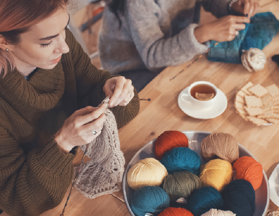 The Healing Stitch is a ten-session program that is offered in two blocks of five sessions each. Sessions are conducted weekly and consist of the same participants each week. The program takes a cognitive-behavioural (CBT) approach and as such is evidence-based, with topics including: the neuroscience of knitting & crochet, core beliefs, window of tolerance, self-compassion, perfectionism, behavioural activation (action before motivation) and mindfulness. We use knitting and crochet to apply the principles of CBT and in the process have fun, drink cups of tea, establish connections with others, learn from others and just generally